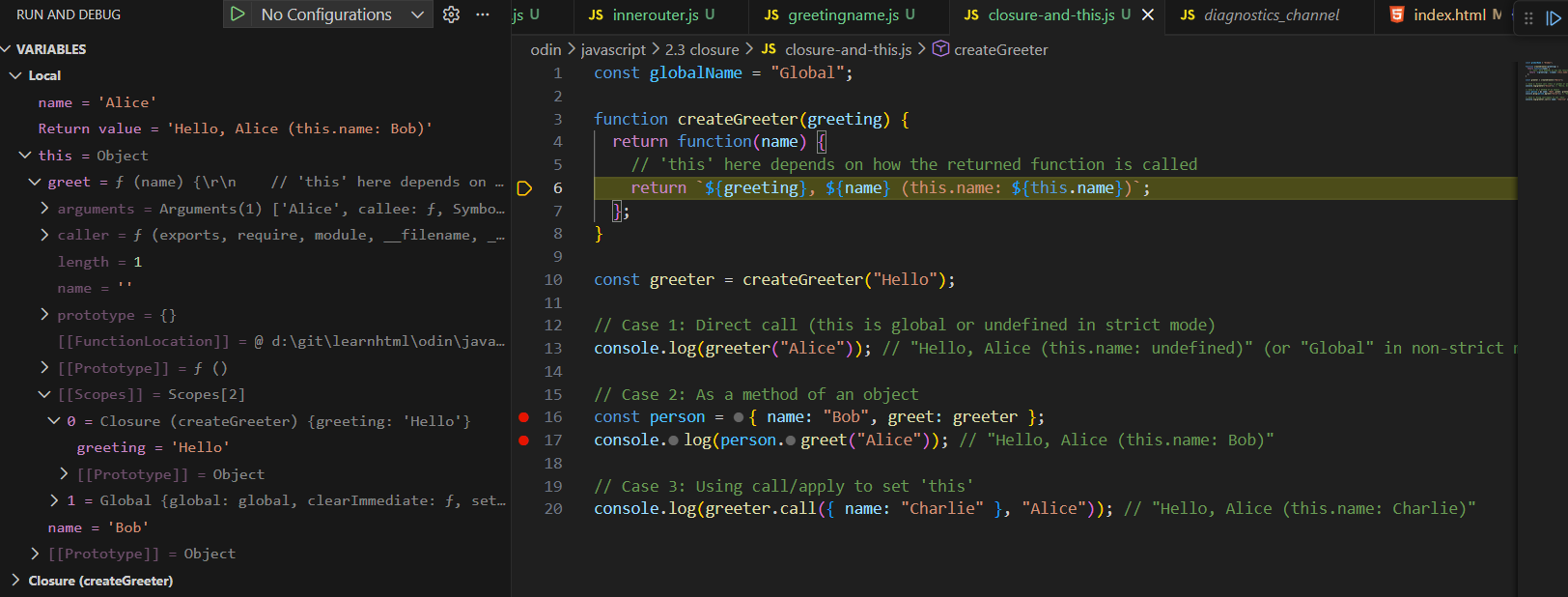 let name = "default";insidecreateGreeter. This variable is only accessible within the closure created bycreateGreeterand its returned function. It is updated to"defaultname"after the first call. - The second is the