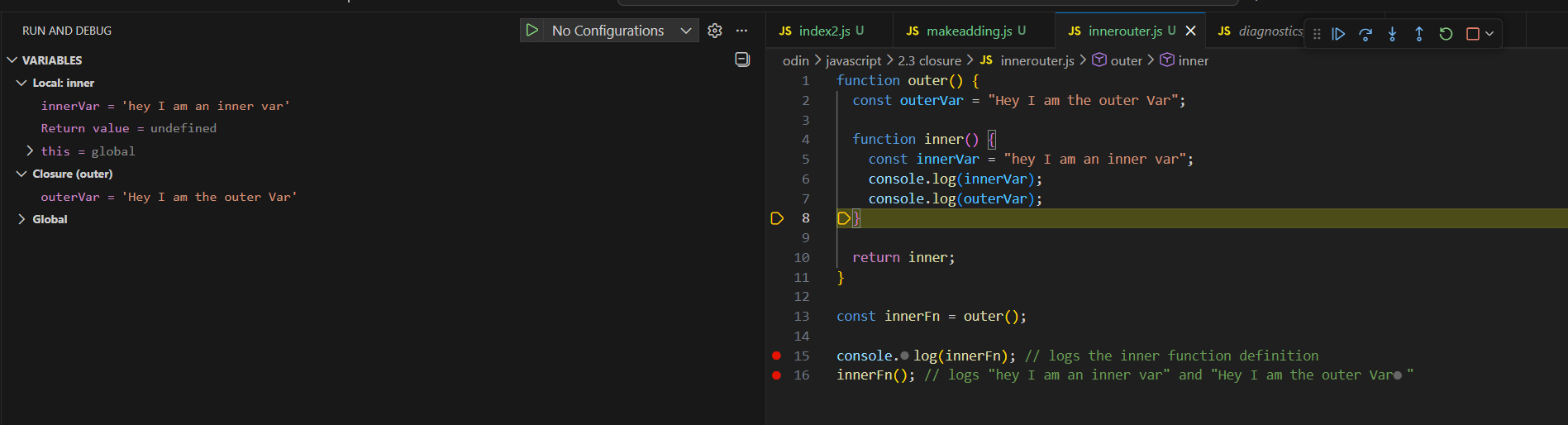 Recently I have been learning JavaScript following The Odin Project. I came across this idea of closure and scope, which I was not familiar with during my Python learning. After experimenting with the Node.js debugger, the concept started making sense to me. I think it is worth recording and sharing in case someone has the same struggles.